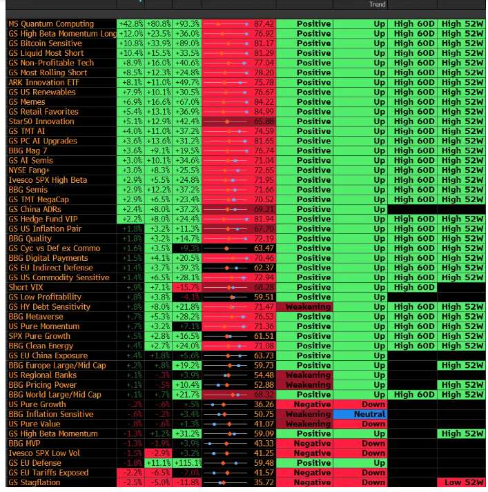 尽管看涨情绪在上周将若干全球股票基准指数推入超买区域,但正如下图所示,市场中一些风险最高的投资角落仍表现出持续强劲的涨势。