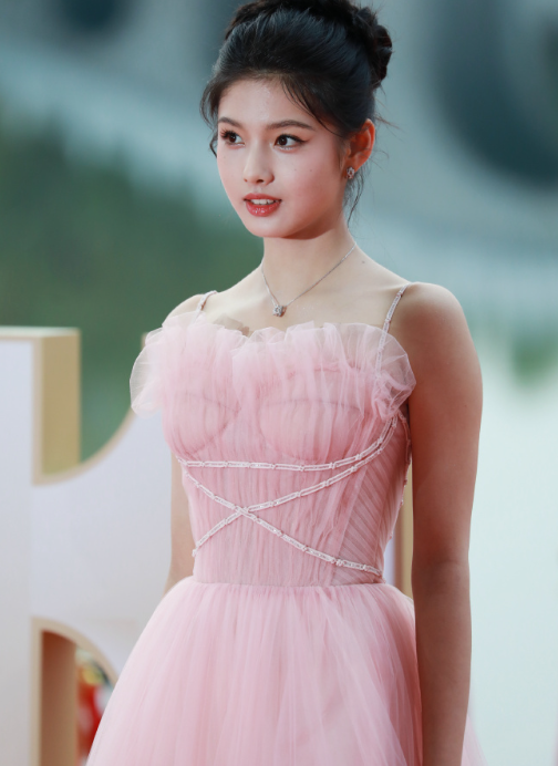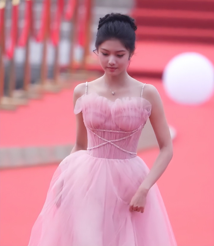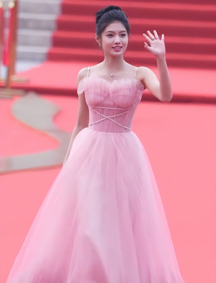 不仅如此,这次她选择了一条很符合自己气质的粉色抹胸礼服,跟一位小公主似的,造型格外甜美。